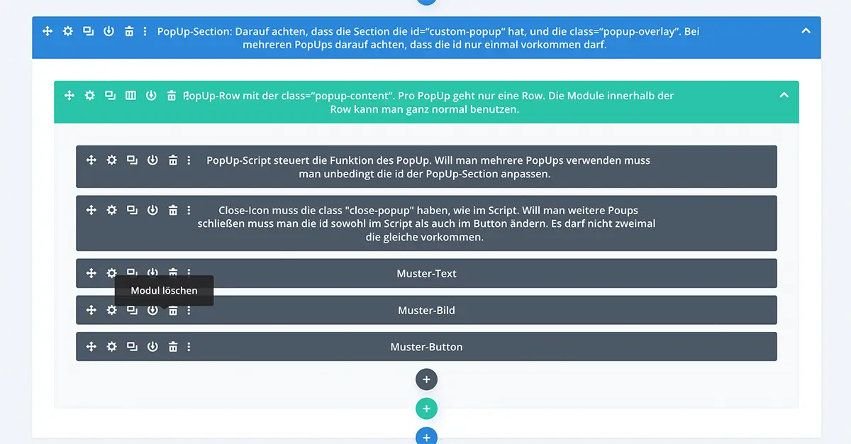 Wenn Du die PopUp-Section auf Deiner Seite installiert hast ist sie im Visual-Builder nur in der „Gitter-Ansicht“