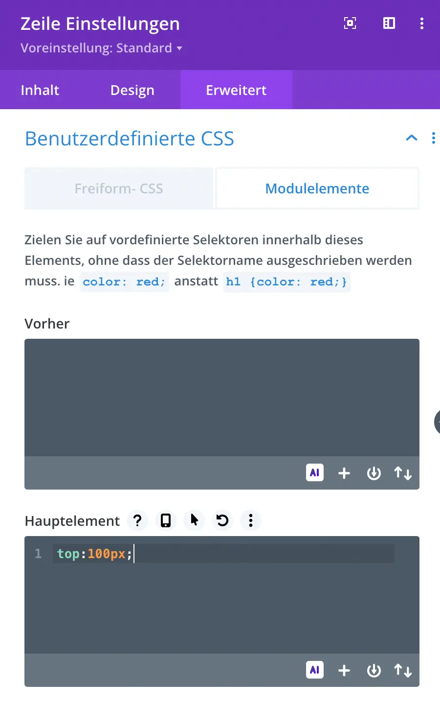Dazu einfach in Zeile Einstellungen – Erweitert – Benutzerdefiniertes CSS – Hauptelement gehen.