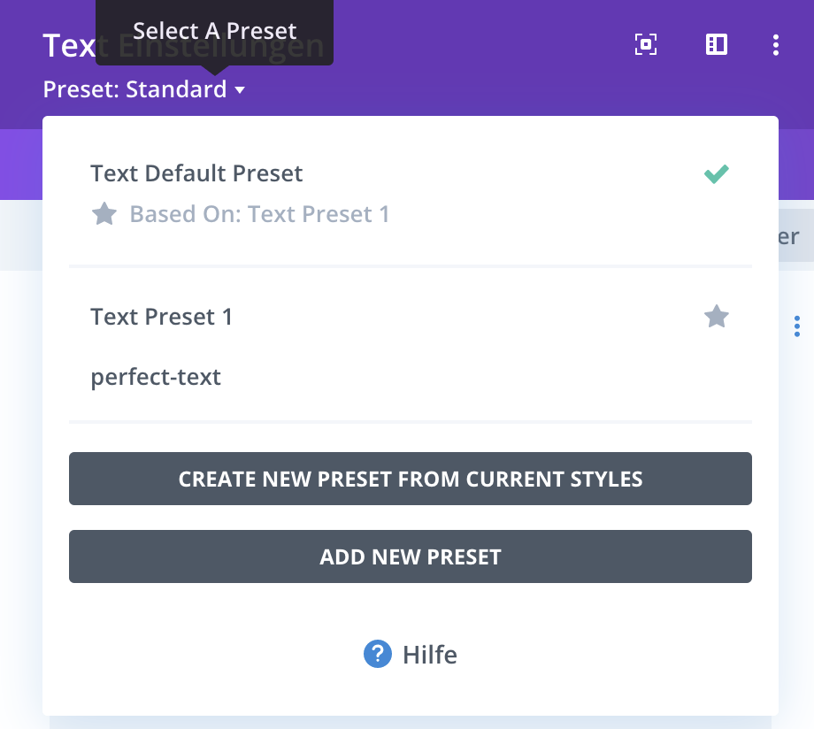 Wenn man jetzt ein weiteres Textmodul benutzt stehen einem zwei Presets zur Verfügung. Einfach auswählen, und schon hat man alle vorgenommenen Einstellungen.