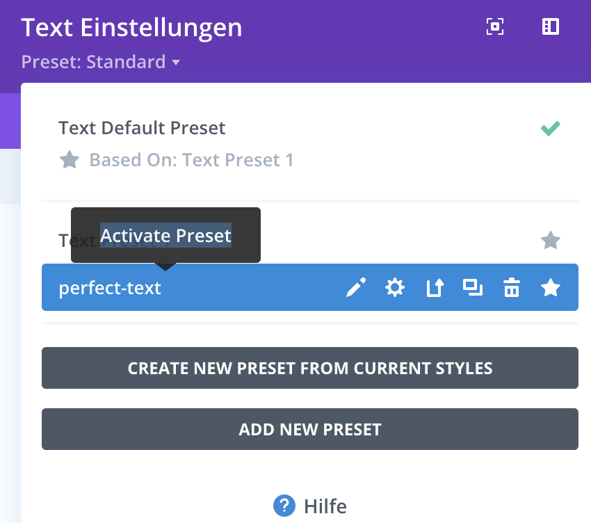 In dem Textmodul wurden alle Parameter wie Größen von Schriften und Überschriften, sowohl auf Desktop als auch auf Mobilgeräten angepasst. Eine Arbeit, die bei jedem Projekt anfällt. Um sich diese zu ersparen, ist es sinnvoll alles in einem Preset des Moduls zu speichern.