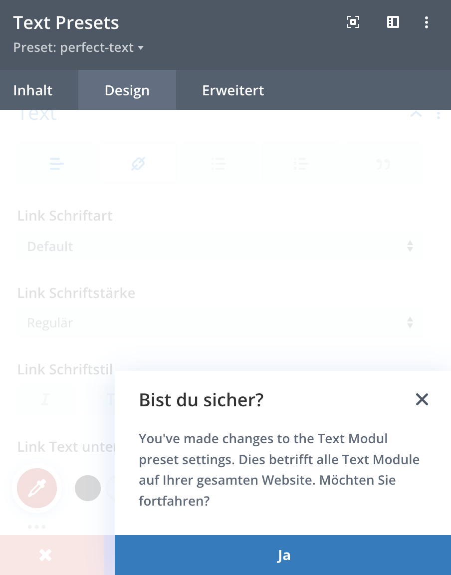 Durch bestätigen mit „Ja“, andert sich jetzt in allen Textmodulen mit diesem Preset die Linkfarbe nach rot. Also ein ähnliches Verhalten wie bei einem globalen Objekt.