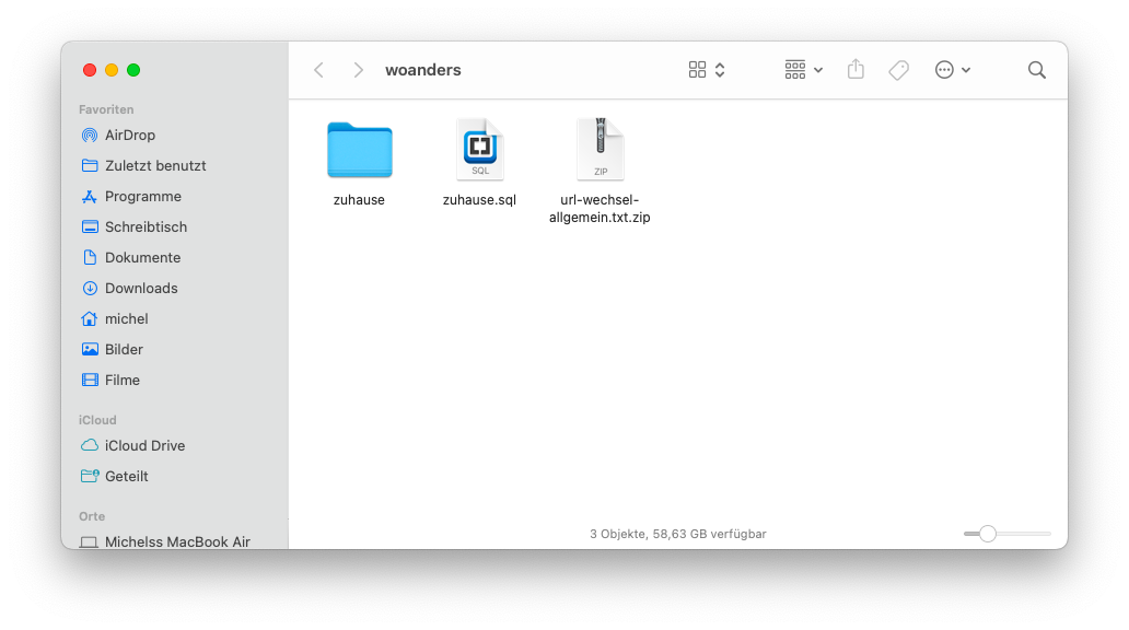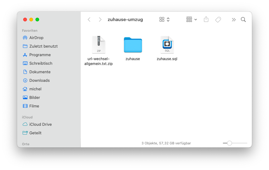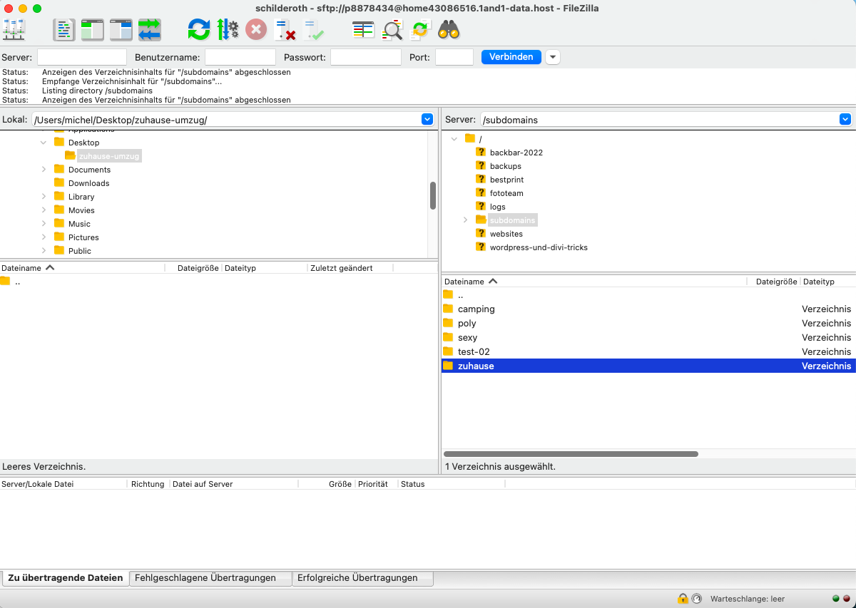 2. Lade über ein FTP Programm Deine WordPress – Seite in diesen Ordner runter. In unserem Beispiel wird die Website „zuhause“ auf dem Desktop im Ordner „zuhause-umzug“ gespeichert.