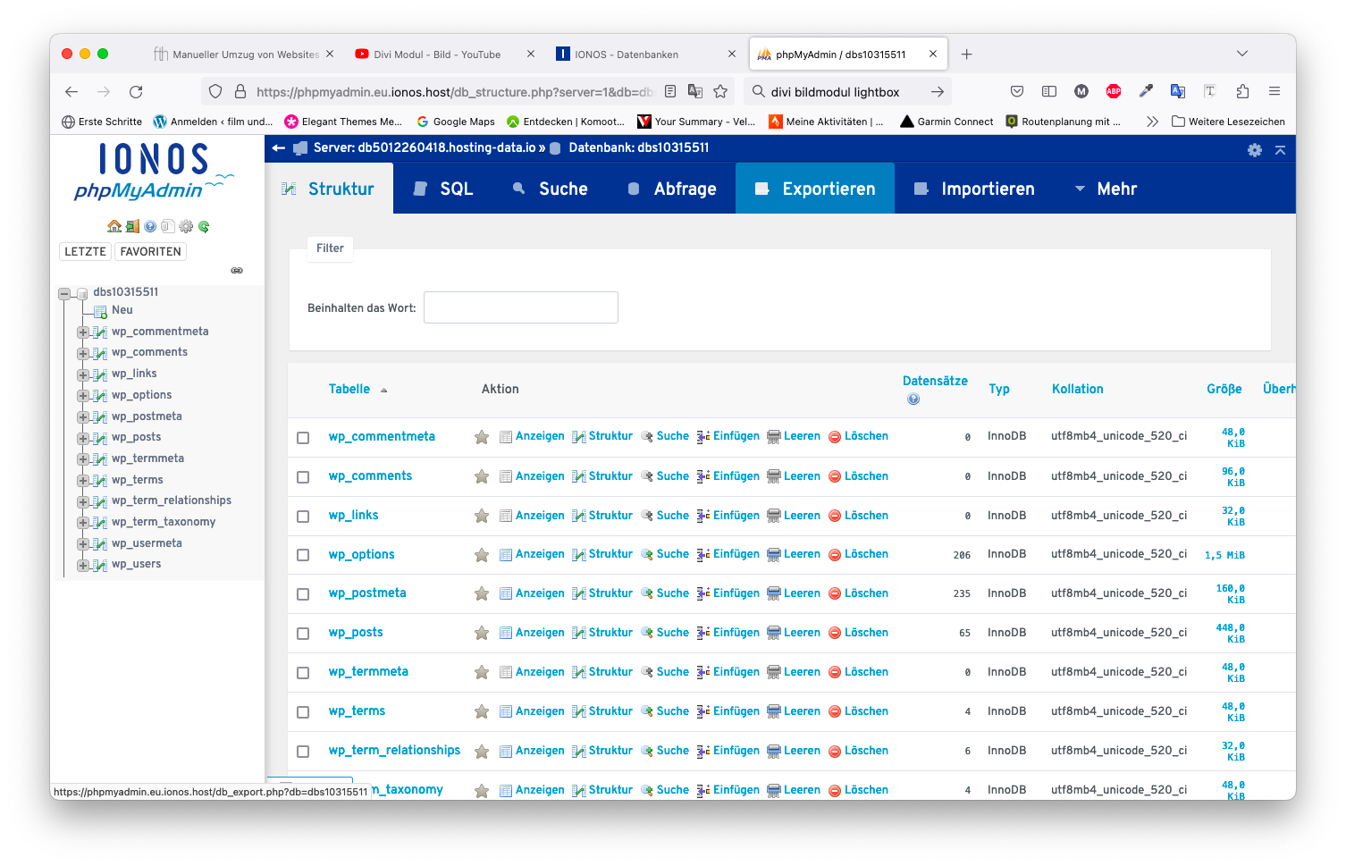 4. im nächsten Schritt lädst Du die zur Website gehörende Datenbank herunter und benennst die um. Das Umbenennen ist nicht erforderlich, sondern dient nur der Übersicktlichkeit. Unser Beispiel bezieht sich auf „ionos“ als Host. Bei anderen Providern kann das ganz anders aussehen.