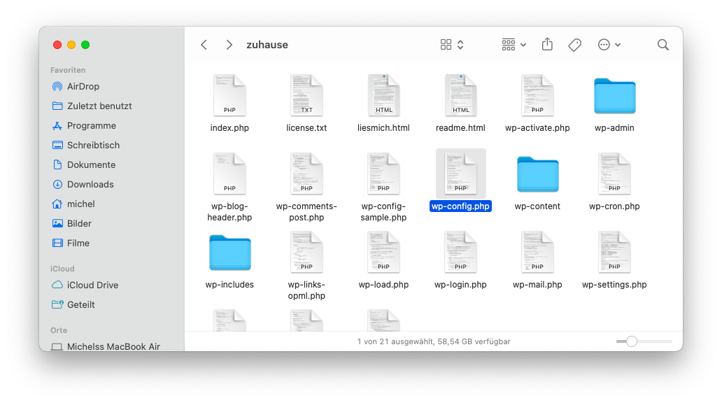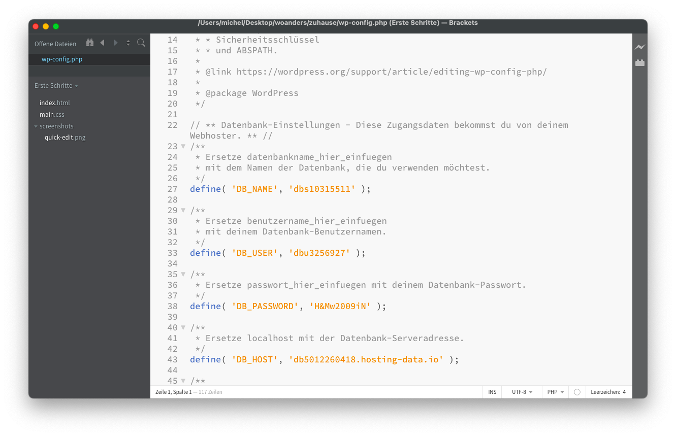 8. Dann öffnen wir die Datei „wp-config.php“ mit einem geeigneten Programm wie z.b. Dreamweaver, Brackets oder einfach ein Textprogramm.