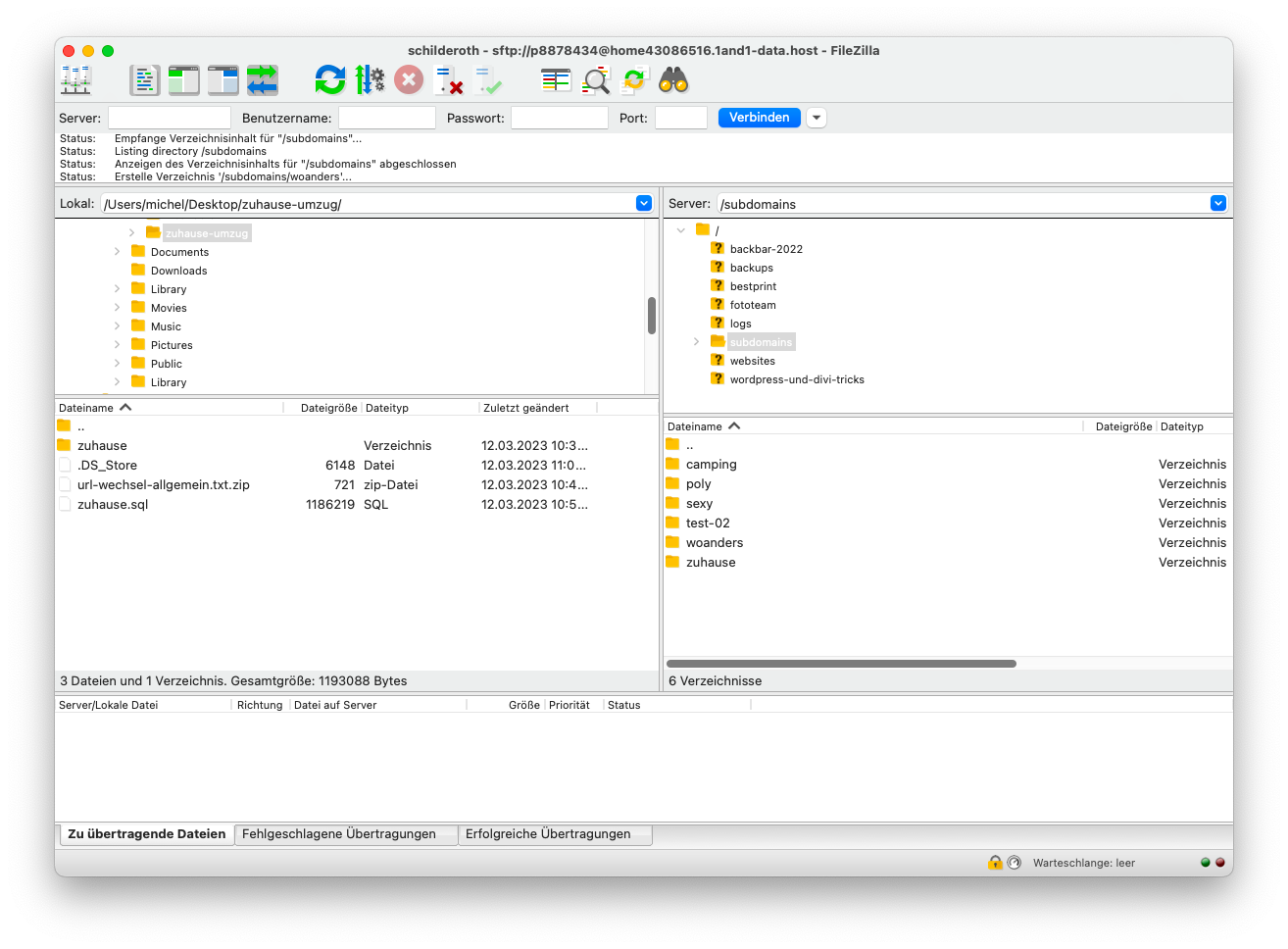 9. Jetzt die Dateien aus dem veränderten Ordner, also aus dem Ordner „woanders/zuhause“, nicht aus dem Ordner „zuhause-umzug/zuhause“, mit dem FTP-Programm an Ihr neues Ziel hochladen.