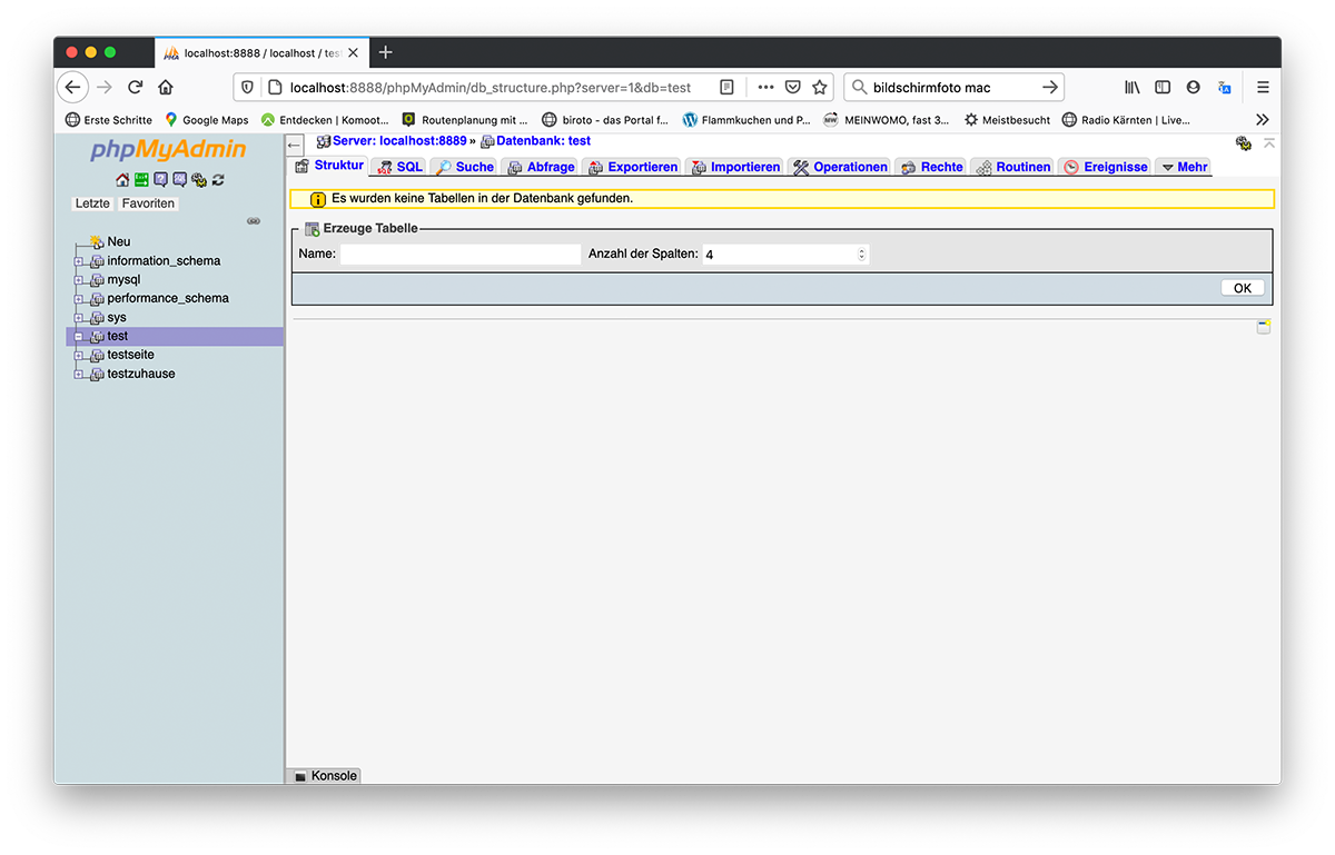 Wenn man den lokalen Server weiterhin bentzen möchte, ist es sinnvoll, die Datenbank zu sichern, bzw. nicht zu verändern. Das geht am einfachsten durch eine Kopie der vorhandenen Datenbank in MAMP. Wir wollen in unserem Fall eine eine Kopie der Datenbank "test" erstellen.
