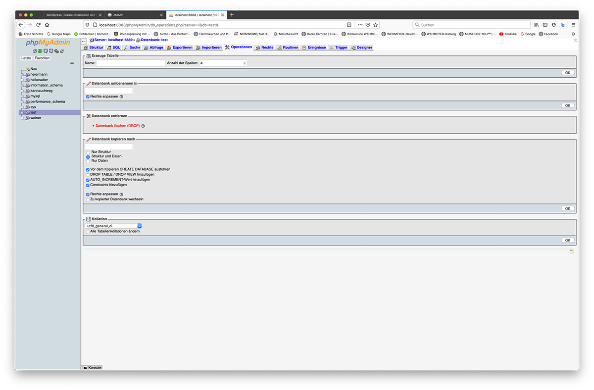 Den Reiter "Operationen" auswählen. In das Feld "Datenbank kopieren nach" den neuen Namen schreiben. Hier "test-server".