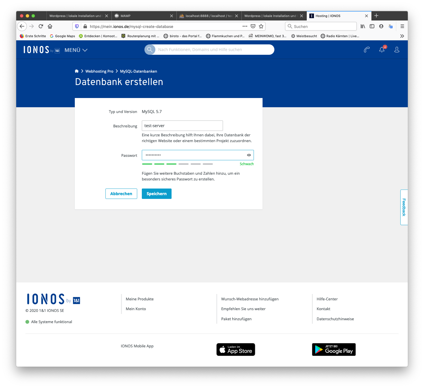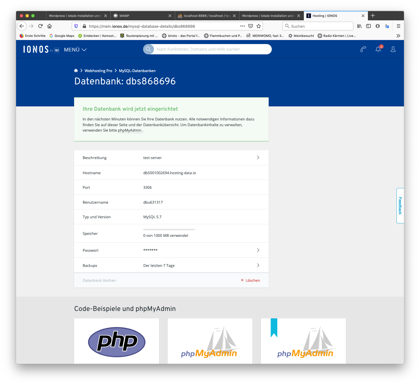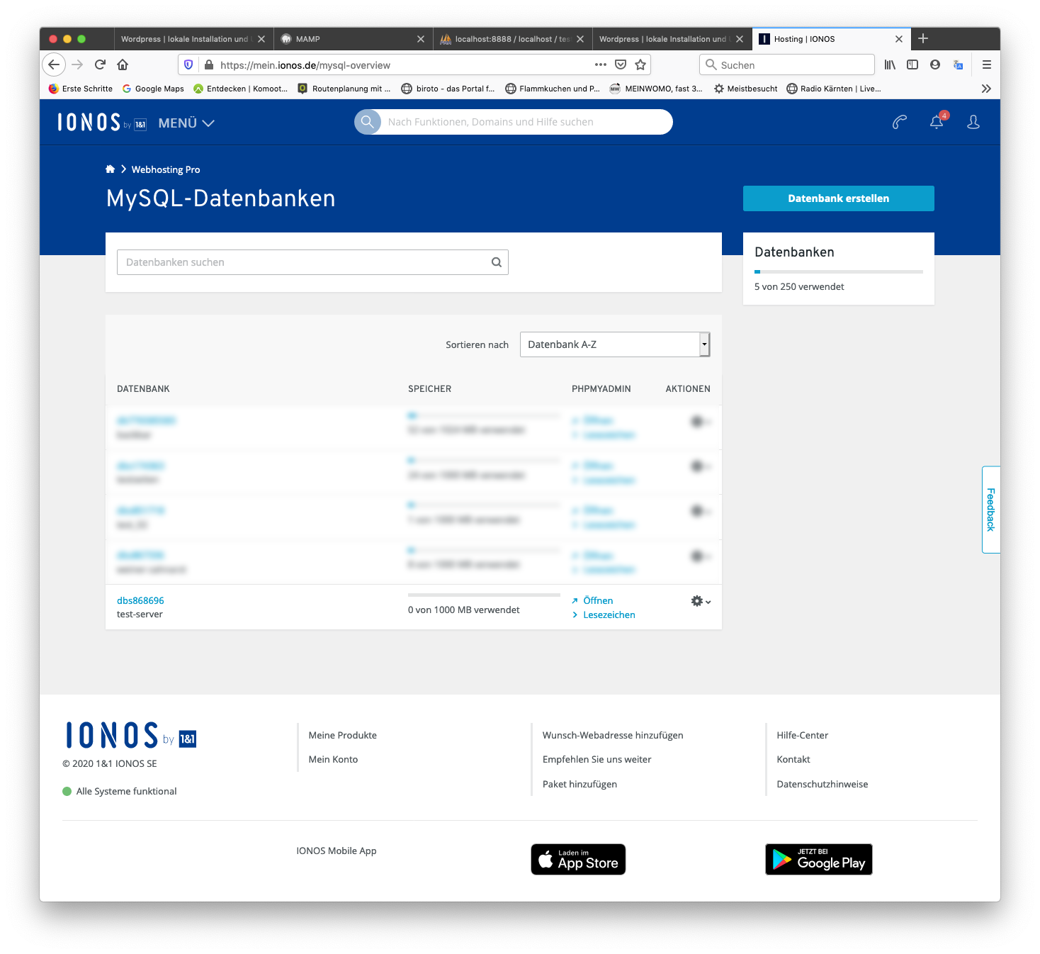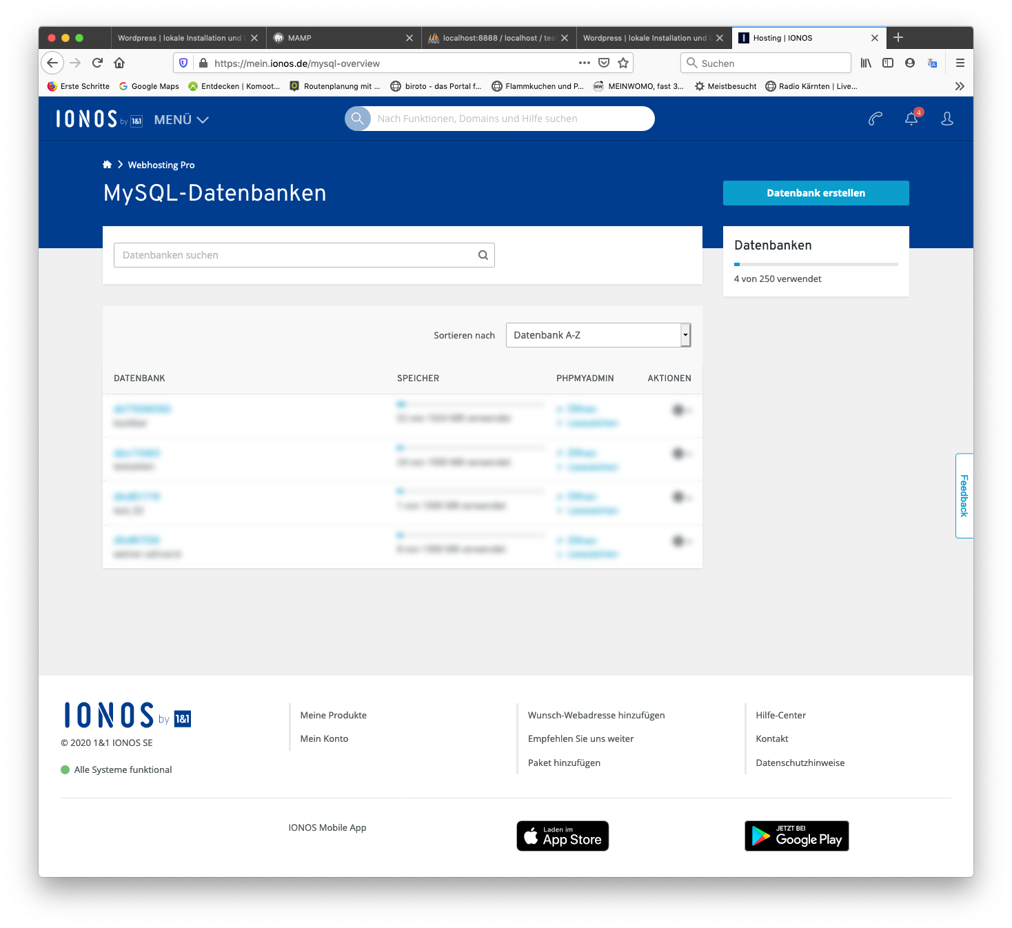 In diesem Beispiel wir die Datenbank bei IONOS eingerichtet. Einfach oben rechts "Datenbank erstellen" anklicken, und der Anweisung folgen. Das kann je nach Provider natürlich von Fall zu Fall anders aussehen.