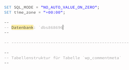 Alles markieren und in die Zwischenablage kopieren. Anschließend in einen geeigneten Texteditor z. B. "Dreamweaver" einfügen und als SQL Datei mit dem Namen "datenbank" speichern. In diesem Dokument mit der "finden Funktion" nach "Datenbank" suchen.