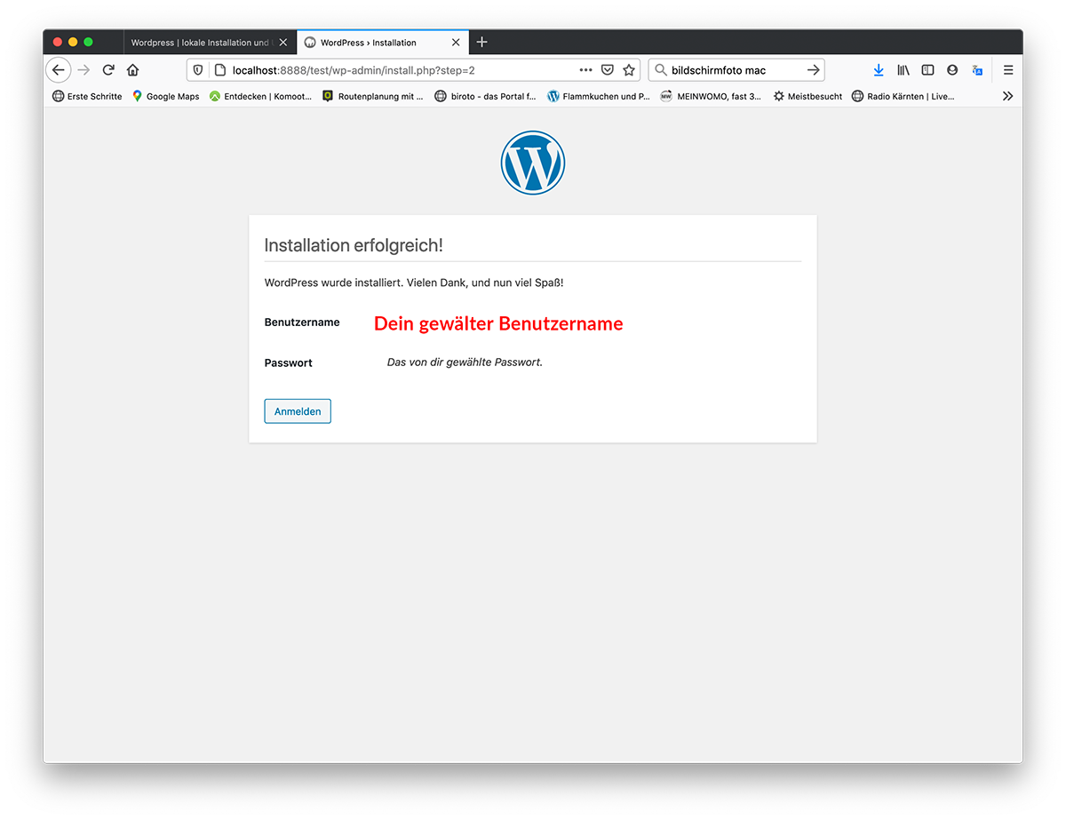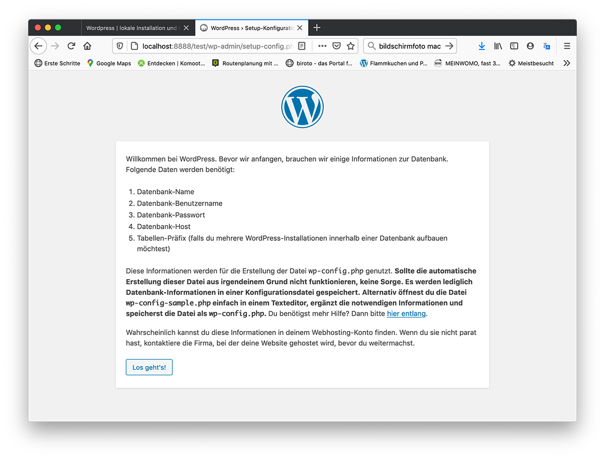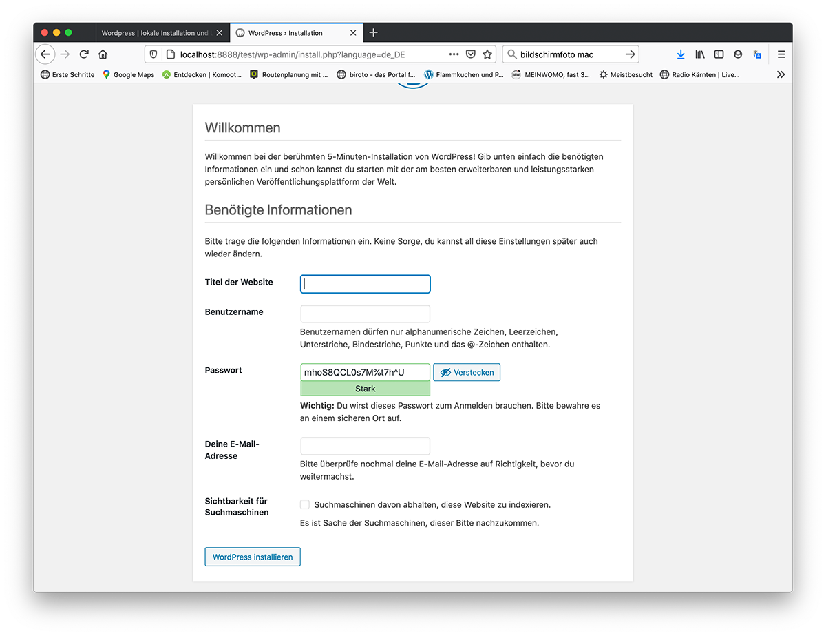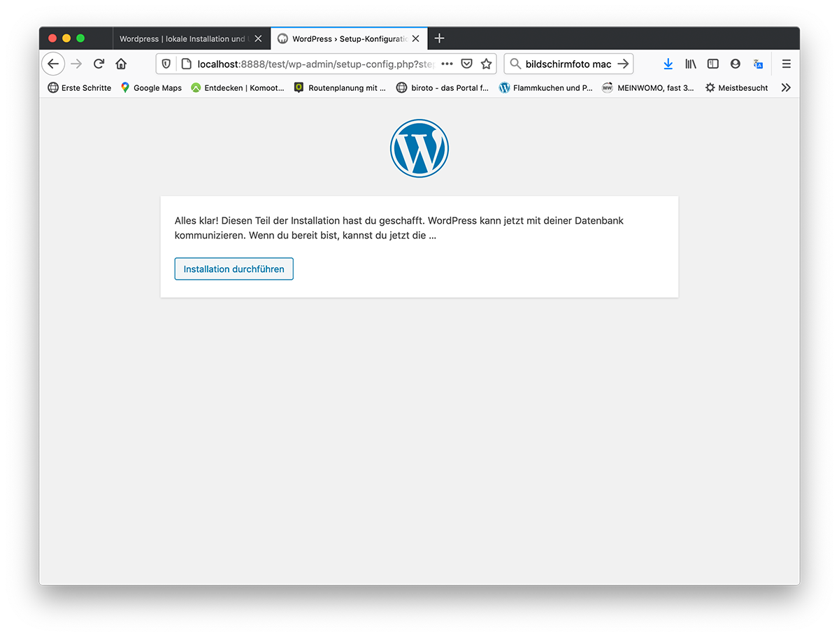 Nun kann man Wordpress installieren bzw. erstmalig starten.Als Url geben wir folgendes ein:
