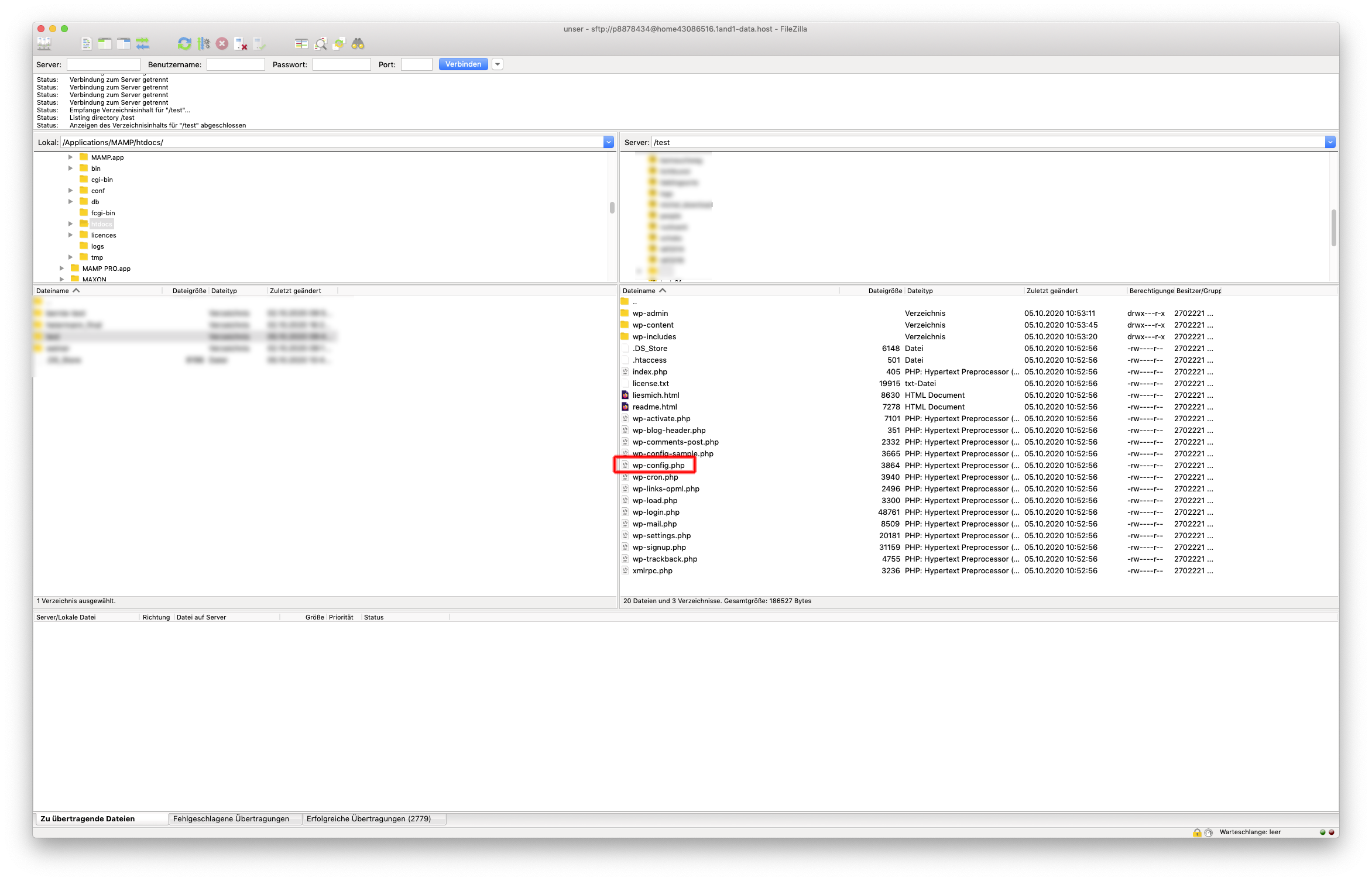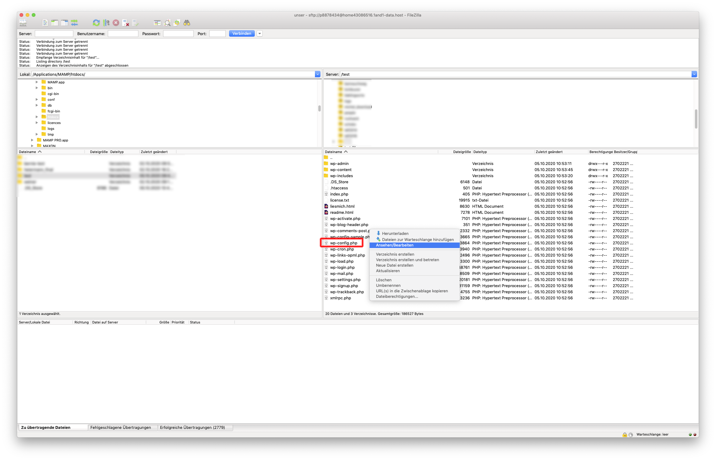 Mit Hilfe unseres FTP-Programms müssen wir noch ein paar kleine veränderungen in der "wp-config.php" vornehmen. Das die Datei mit Hilfe eines Texteditors öffnen.